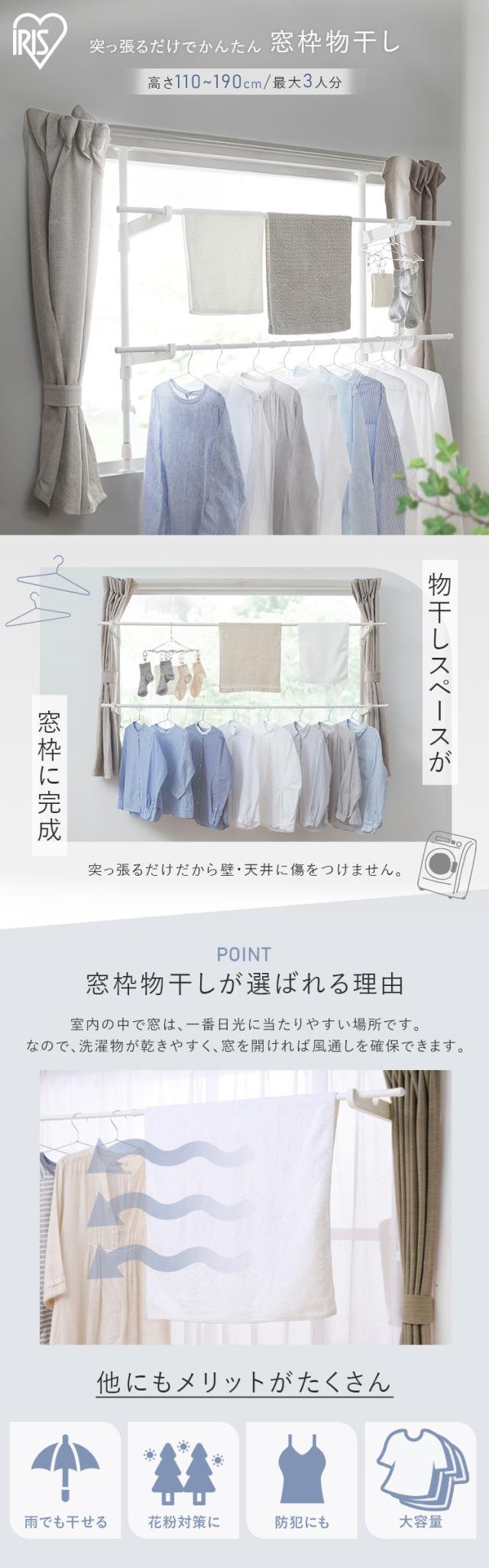 ★全品対象250円offクーポン★ 洗濯物干し 室内 突っ張り 窓枠物干し 高さ110-190cm 伸縮自在 省スペース 簡単設置 突っ張り物干し つっぱり 物干し 室内物干し 部屋干し 梅雨 除湿機 サーキュレーター 花粉 一人暮らし 防犯 腰高窓 ホワイト アイリスオーヤマ MW-190NR *
