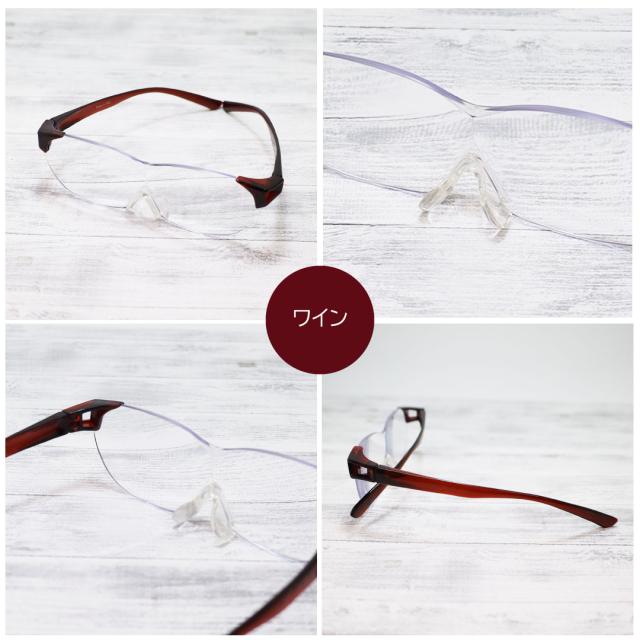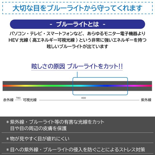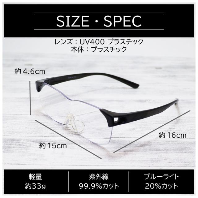 ・紫外線99.9%以上カット。・ブルーライト20%カット。・拡大率1.6倍。・枠なしレンズ。