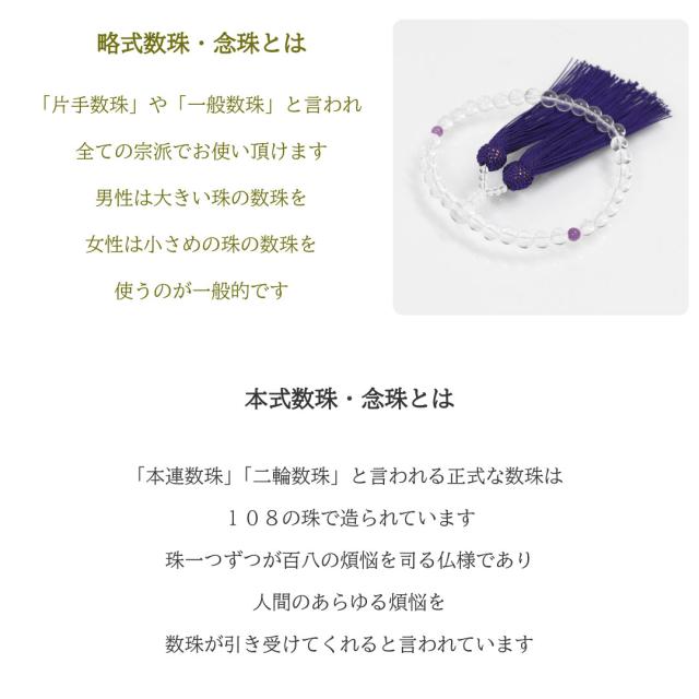 本数珠とは違い、片手数珠・一般数珠とも言われ、近年では多く使われています。