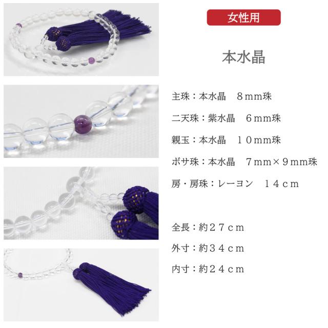 数珠 女性用 水晶 念珠 略式念珠 本水晶 紫翡翠 アメジスト クリア 紫 パープル 8mm 葬式 葬儀 法事 数珠入れ 全宗派対応