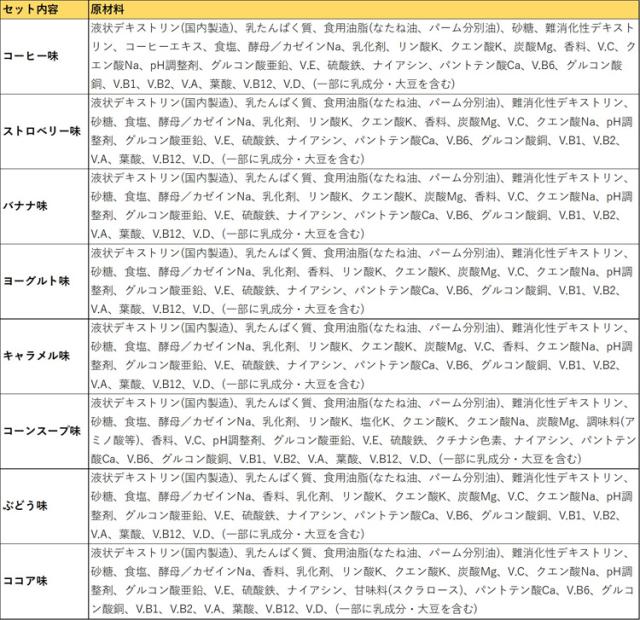 | 1本(125ml)当たり エネルギー:200kcal、たんぱく質:7.5g、脂質:5.6g、炭水化物:31.8g、糖質:29.3g、食物繊維:2.5g他 |