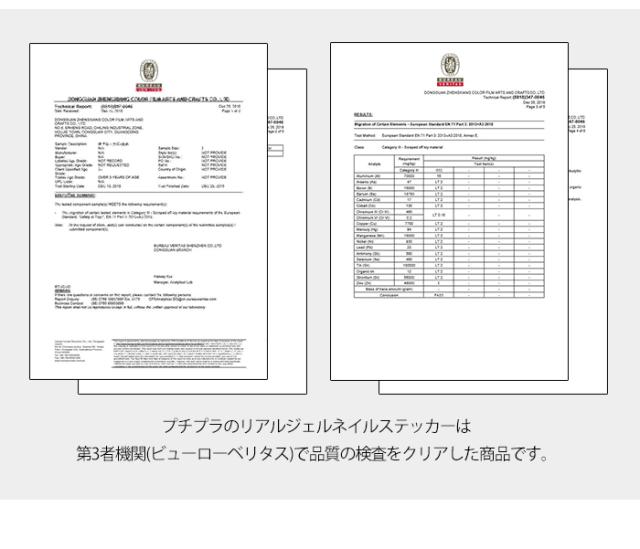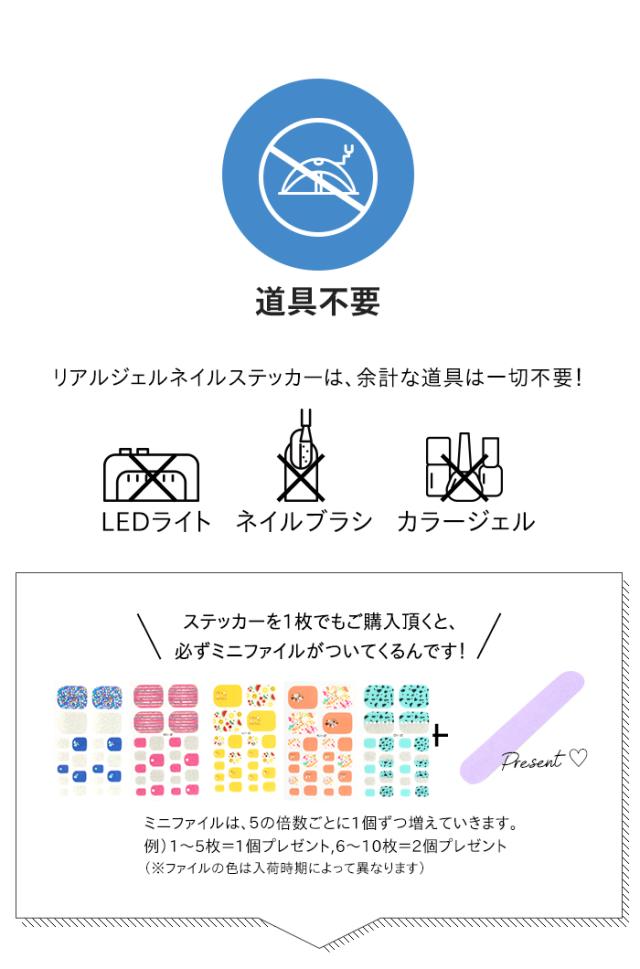 | 注意事項 | ・爪表面に油分が多いと貼りつきにくい場合がございます。表面の油分をクレンザー等で、除去しステッカーを貼り付けてください ・ファイルは消耗品のため、目が無くなったら新しいファイルでファイリングしてください ・破れやすい商品となりますので、扱う際はピンセット等で優しく扱って下さい。 ・入荷時期によって、色合いに若干の差異が生じる場合がございます。 ・ご覧になるモニターにより、カラーの見え方が異なる場合がございます。 ・パッケージのデザイン、ネイルファイルのカラーが異なる場合がございます。 ・パーツ等貼り付けている場合、オフする際、ゆっくりと剥がしてください。 ・乳白色や装飾の多いデザインは、それぞれシールの厚みが異なる場合がございます。 また入荷時期によって、製造工程が異なる場合があり 同じデザインでも色味や厚みが異なる可能性がございます。 予めご了承くださいませ。 |