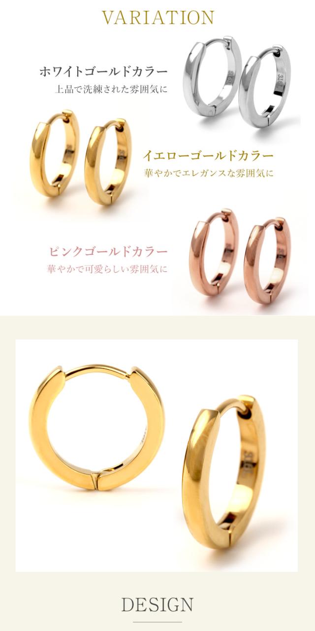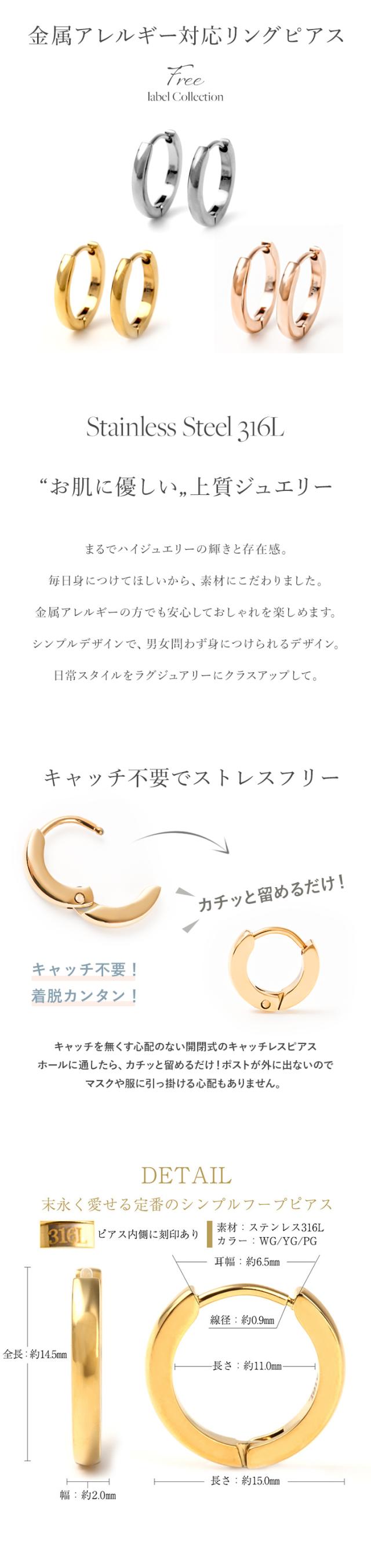 【金属アレルギー対応】アレルギーの方にも優しいサージカルステンレス316Lを使用。錆びにくく、変色が少ないお肌に優しいフープピアス。ワンタッチタイプのリングピアスは着脱がかんたん。末永く愛せる定番スタイルのシンプルフープピアス。【素材・商品サイズ】全長約14.5mm 幅約2.0mm 直径約15.0mm 内径約11.0mm 重さ約2.0g(ペア) ピアス針:太さ約0.9mm 耳幅:長さ約6.5mm カラー:ホワイトゴールドカラー/イエローゴールドカラー/ピンクゴールドカラー 付属品:専用ポーチ【専用ポーチ付き】専用ポーチにお入れしてお届けしますので、ご自身へのご褒美や彼女や奥様に、男性から女性へ大切な想いを伝えるプレゼント・女性へのギフトとしてもおすすめです。嬉しい両耳セット価格のノンアレルギーフープピアス。またバレンタイン・ホワイトデー・母の日・クリスマス・出産祝いのプレゼント・お嬢様への卒業式や入学式のお祝いなどでも人気の商品です。【ネコポス便】こちらの商品はネコポス便発送となるため、代金引換、時間指定はご利用できませんので予めご了承下さい。( ポスト投函または手渡し)