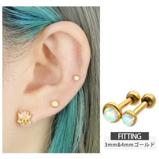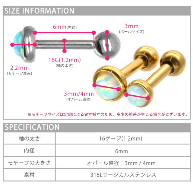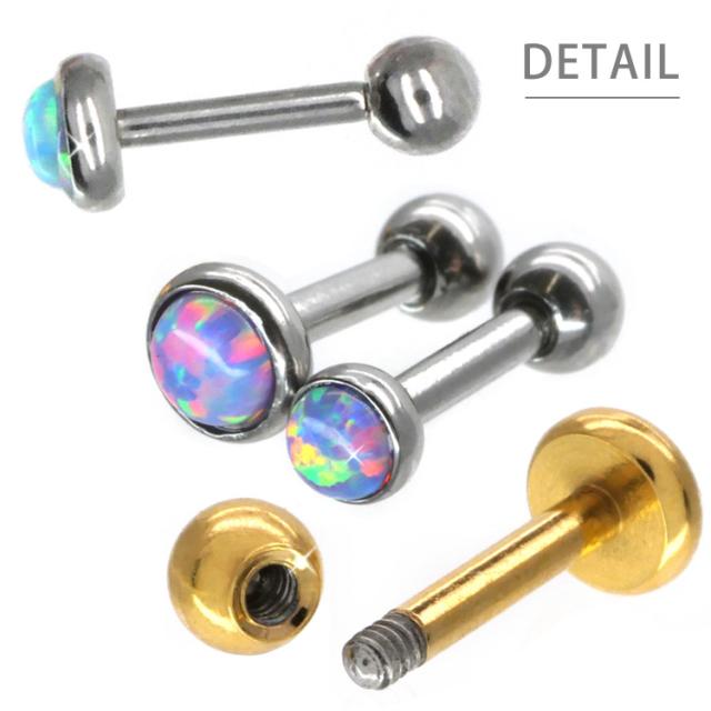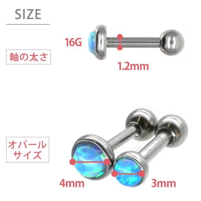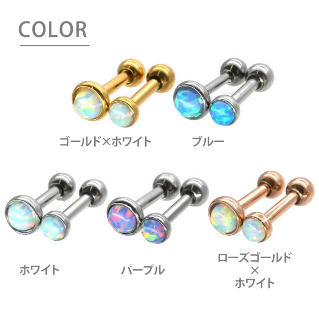 鮮やかな輝きで高級感のある、人工オパールのバーベル。3mm、4mmのプチサイズで上品に高見えします。 爪留めでないベゼルセットは引っ掛かりにくく、普段使いや着けっぱなしでも快適ですよ!太さは18G・16Gの2サイズ。耳たぶだけでなく、耳の軟骨部分にもピッタリです。もちろん金属アレルギーにも安心安全の医療用ステンレス素材です。