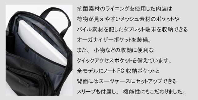 抗菌素材のライニングを使用した内装は、荷物が見えやすいメッシュ素材のポケットや、パイル素材を配したタブレット端末を収納できるオーガナイザーポケットのほか、小物などの収納に便利なクイックアクセスポケットを備えています。