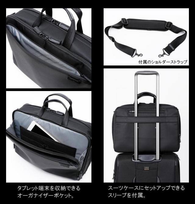 エキスパンダブル(拡張)機能付きで、荷物が多い方におすすめのブリーフケース。収納部にはペットボトルホルダーを装備しています。ショルダーストラップ付属。