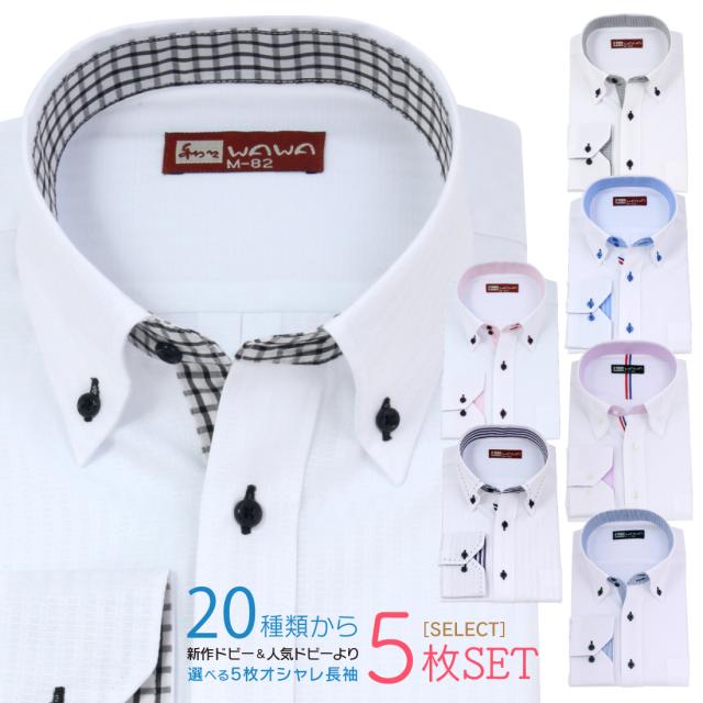 選べる 長袖 5枚セット 白ドビー メンズ ワイシャツ ホリゾンタルカラー ボタンダウン スリム 形態安定 標準体 クールビズ カッターシャツ ビジネス カジュアル 20種から選べる5枚セット Aシリーズ 送料無料