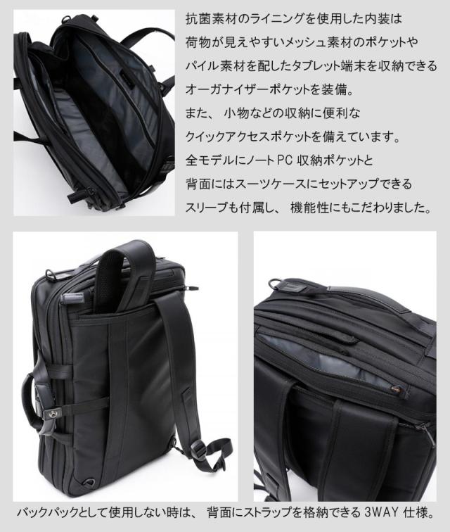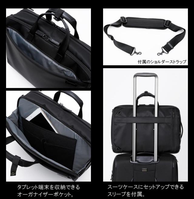 背面にバックパックストラップを格納できる3WAY仕様で、ビジネスから1泊出張まで幅広く活躍します。