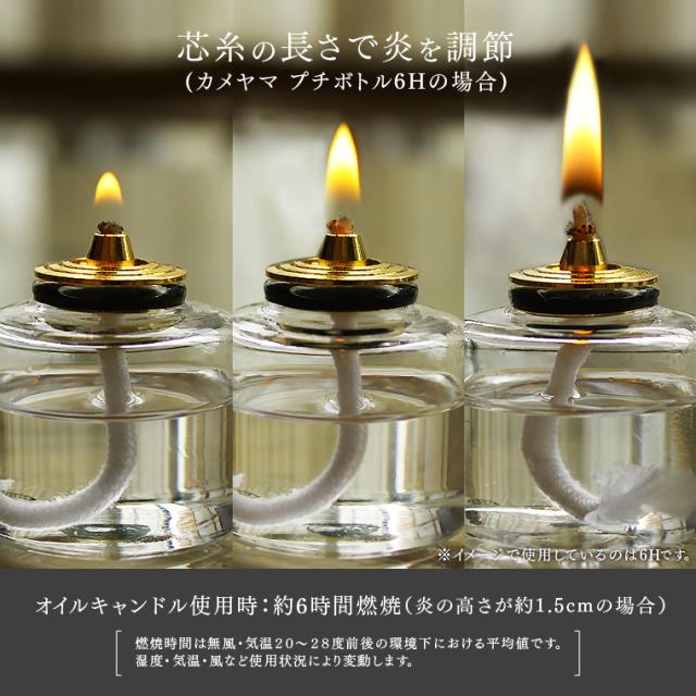 煙(スス)やにおいがほとんど出ず、底面も熱くなりません。燃焼時間は、10mlにつき約2時間です。