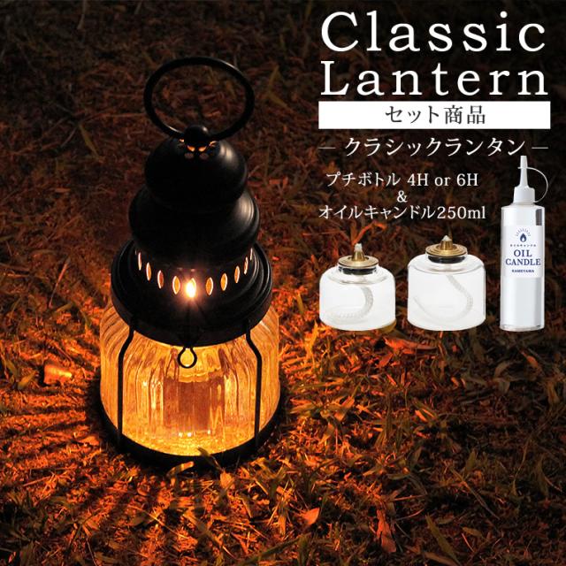 【セット】クラシックランタン+オイルキャンドル250ml+プチボトル(4Hor6H)セット カメヤマ レトロ かわいい キャンドルランタン 炎 生火 液体燃料 リキッドキャンドル付き キャンプ アウトドア 防災 停電対策 アンティーク風 屋内 屋外 室内 野外 agesugi_ssp