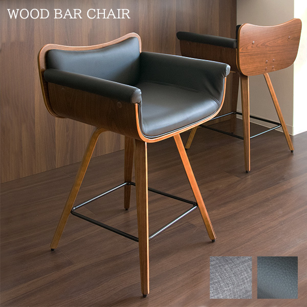 曲木に包まれる バーチェア / カウンターチェアー 木製 肘付き 背もたれ付き ハイチェアー ファブリック レザー クッション 黒 グレー 回転式 足置き付き 合皮 大きめ座面 高さ60 ゆったり カウンター椅子 ハイタイプ