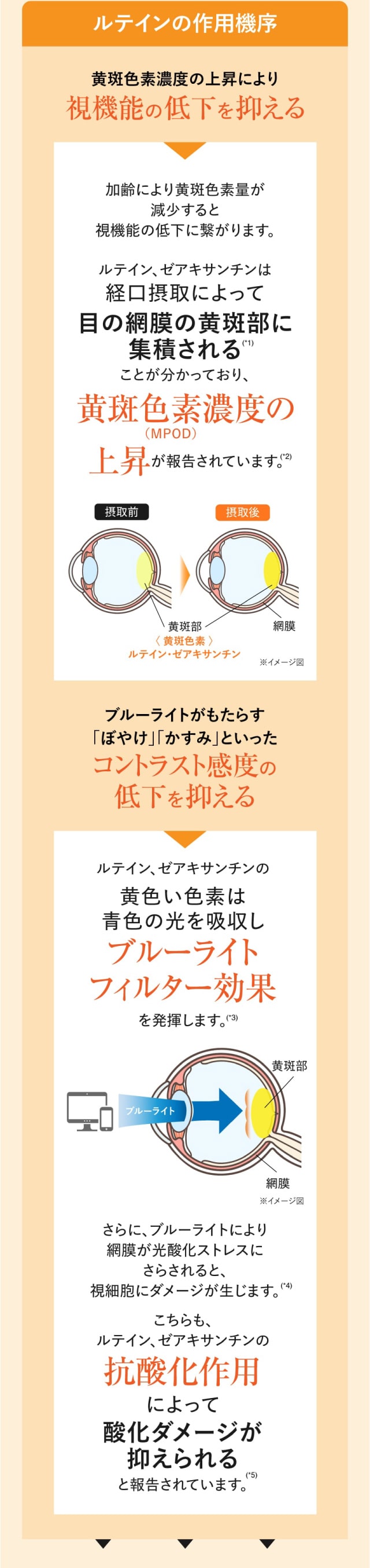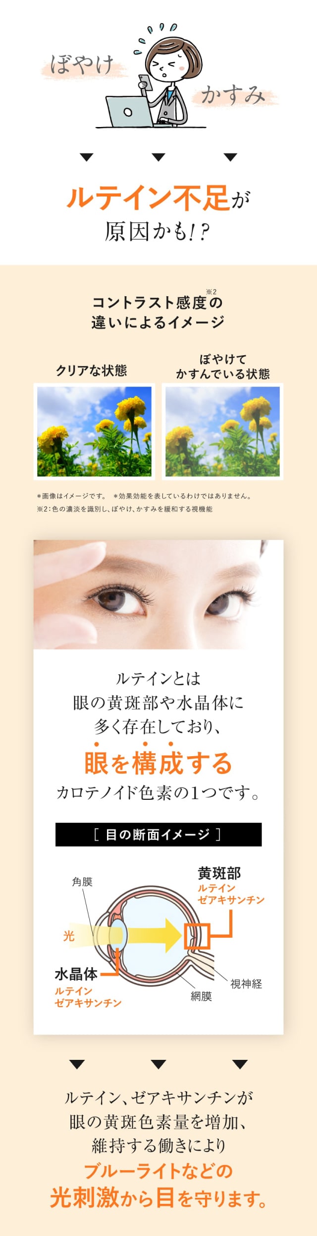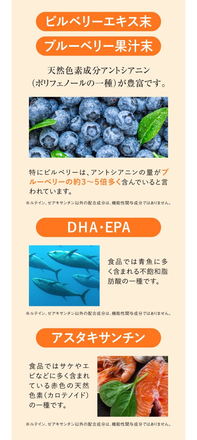 | 届出表示 | 本品にはルテイン、ゼアキサンチンが含まれます。ルテイン、ゼアキサンチンは、眼の黄斑色素量を増加、維持する働きがあり、コントラスト感度(色の濃淡を識別し、ぼやけ、かすみを緩和する視機能)、グレア回復(まぶしさから回復する視機能)のサポート、ブルーライトなどの光ストレス、一時的な精神ストレス、眼の疲労感の軽減に役立ち、睡眠の質を高める機能があることが報告されています。 |