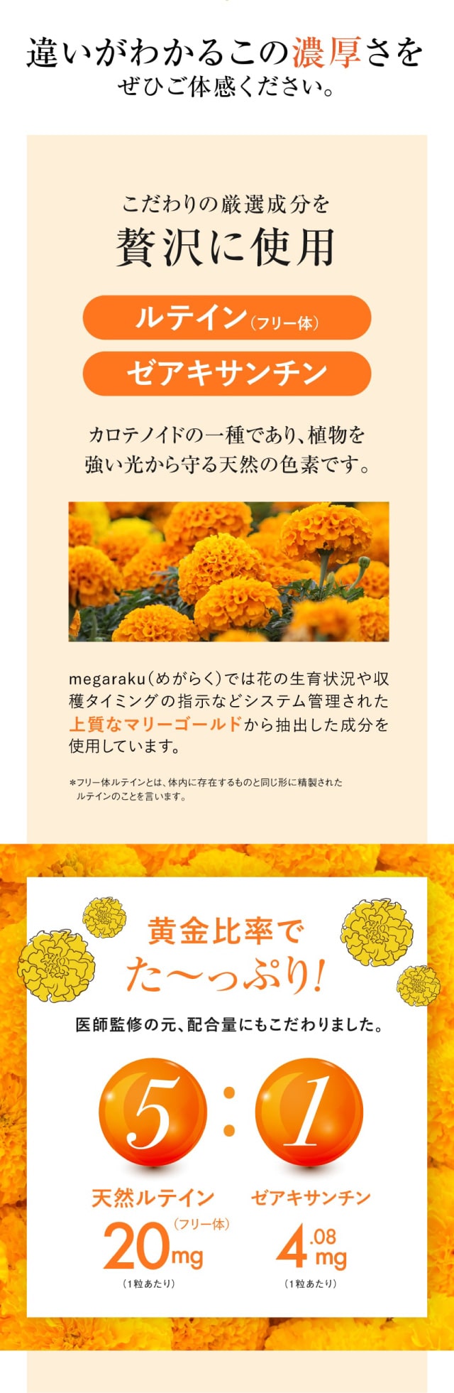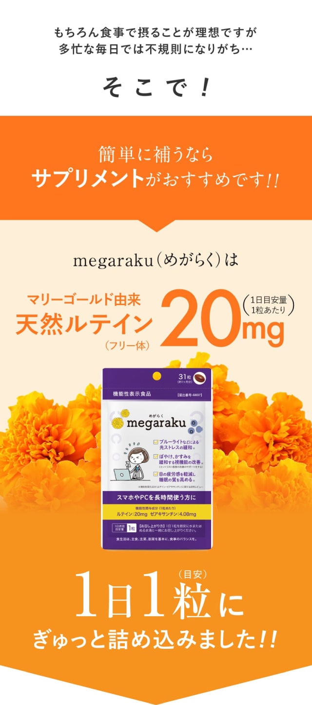 「めがらく」はスマホなどの画面を長時間見る方、もやっと感が気になる方におすすめの食品です。主成分として、1カプセルあたりマリーゴールド由来のルテインを20mg、ゼアキサンチンを4.08mg、贅沢に配合いたしました。
