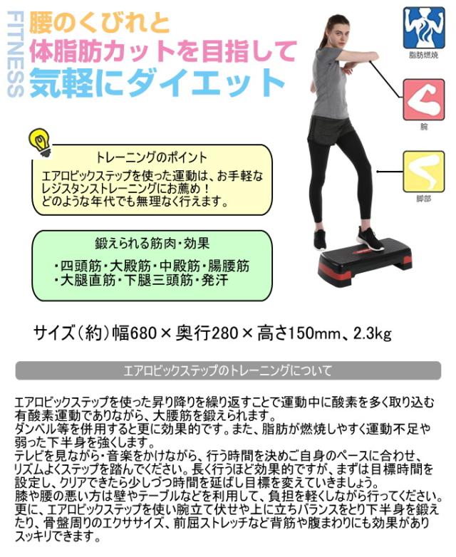 | 特徴 | 腰のくびれと体脂肪カットを目指して気軽にダイエット。 エアロビックステップを使った運動は、お手軽なレジスタンストレーニングにお薦め。 どのような年代でも無理なく行えるトレーニング方法です。 そのほかのダイエット・フィットネス関係はこちら↓ ダイエット・フィットネス関係 |