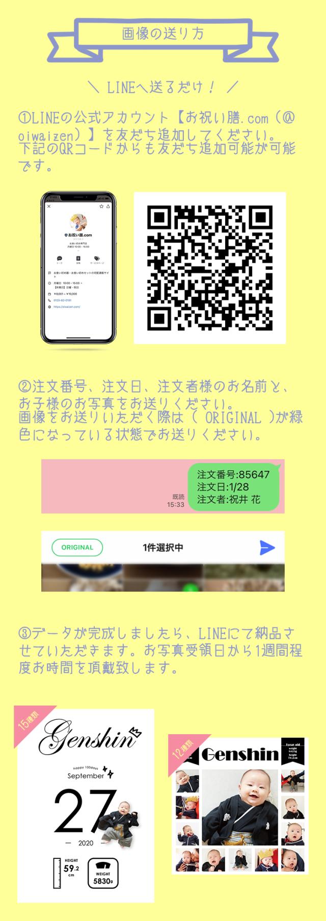 2.注文番号、注文日、注文者様のお名前、お子様のお名前と、生まれて100日目の体重・身長・日付をお送りください。
