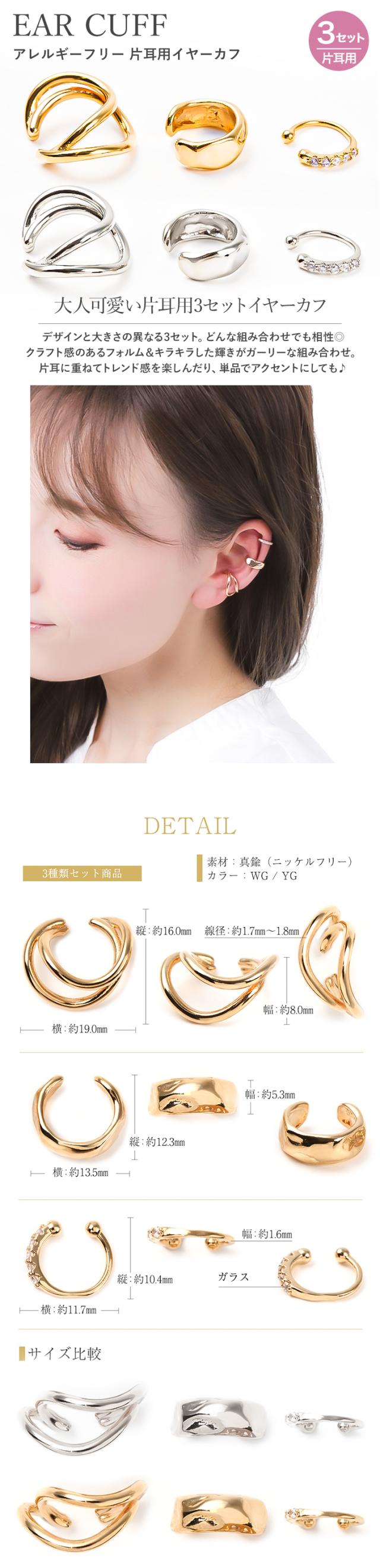 【金属アレルギー対応】アレルギーの方にも優しいニッケルフリーイヤーカフ。デザインと大きさ違いの片耳用3個セットのイヤカフ。シンプルで大ぶりのイヤリングはつけるだけで大人可愛いおしゃれスタイルに。※アレルギーフリーは個人差があり適合しない場合もございます。【素材・商品サイズ】大:全長約16.0mm×19.0mm 幅約8.0mm 線経約1.7〜1.8mm 中:全長約12.3mm×13.5mm 幅約5.3mm 小:全長約10.4mm×11.7mm 幅約1.6mm ストーン:ガラス カラー:イエローゴールドカラー/ホワイトカラー 地金/素材:真鍮(ニッケルフリーメッキ) 付属品:専用ポーチ【専用ポーチ付き】専用ポーチにお入れしてお届けしますので、ご自身へのご褒美や彼女や奥様に、男性から女性へ大切な想いを伝えるプレゼント・女性へのギフトとしてもおすすめです。嬉しい両耳セット価格の揺れるピアス。またバレンタイン・ホワイトデー・母の日・クリスマス・出産祝いのプレゼント・お嬢様への卒業式や入学式のお祝いなどでも人気の商品です。【ネコポス便】こちらの商品はネコポス便発送となるため、代金引換、時間指定はご利用できませんので予めご了承下さい。( ポスト投函または手渡し)