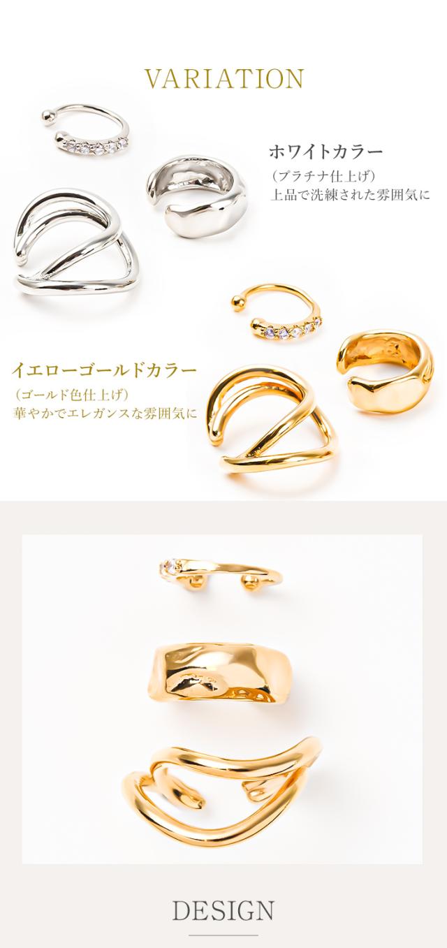デザインとサイズ違いのお得なイヤカフ3個セット。どんな組み合わせでもおしゃれにスタイルアップ。シンプルな大ぶりデザインのイヤーカフスはキラキラと輝く人気の耳飾り。「 18金(18K)仕上げ/ プラチナ 仕上げ 」の華奢で上品なイヤリングはオフィスや通勤はもちろん、リモートワークのときに、お顔周りを華やかに見せてくれます。結婚式やパーティーにも。ニッケルフリーで金属アレルギーに対応しているので、お肌に優しく安心です。