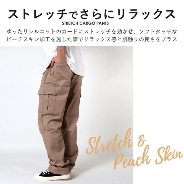 定番のツイル素材にストレッチを効かせ、ソフトタッチなピーチスキン加工を施した事でリラックス感と肌触りの良さをプラス。 カーゴポケットで手ぶらで外出も可能。 |