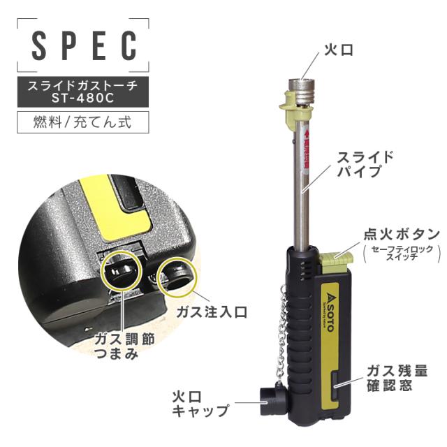 ソト SOTO スライドガストーチ ST-480C 小型バーナー 極細集中炎 ターボ炎 強力耐風 耐風バーナー 小型 コンパクト 伸縮 最大75mm 1300℃ キャップ付 充てん式 安全 カセットガス ライターガス ブラック かっこいい アウトドア 新富士バーナー キャンプ 料理 agesugi_ssp
