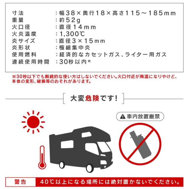 | 仕様 | 炎温度:1,300℃ 炎サイズ:直径3×15mm 炎形状:極細集中炎 使用燃料:カセットガス、ライター用ガス 連続使用時間:30秒以内 |