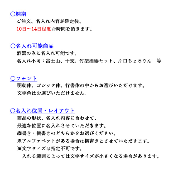 ※能作の酒器アイテムにのみ名入れ可能です。(例外:富士山・干支・竹型酒器セット・片口ちょろりんには名入れできません)