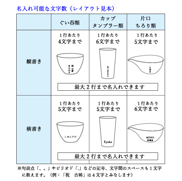 人気商品の能作ビアカップやぐい呑などに、記念日やお名前をレーザー彫刻できます。「お好きな字体、名入れ文字の向き(名入れしたい商品)」をご選択の上、名入れ希望の商品とご一緒にご購入下さいませ。