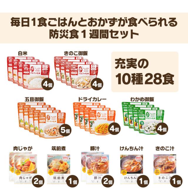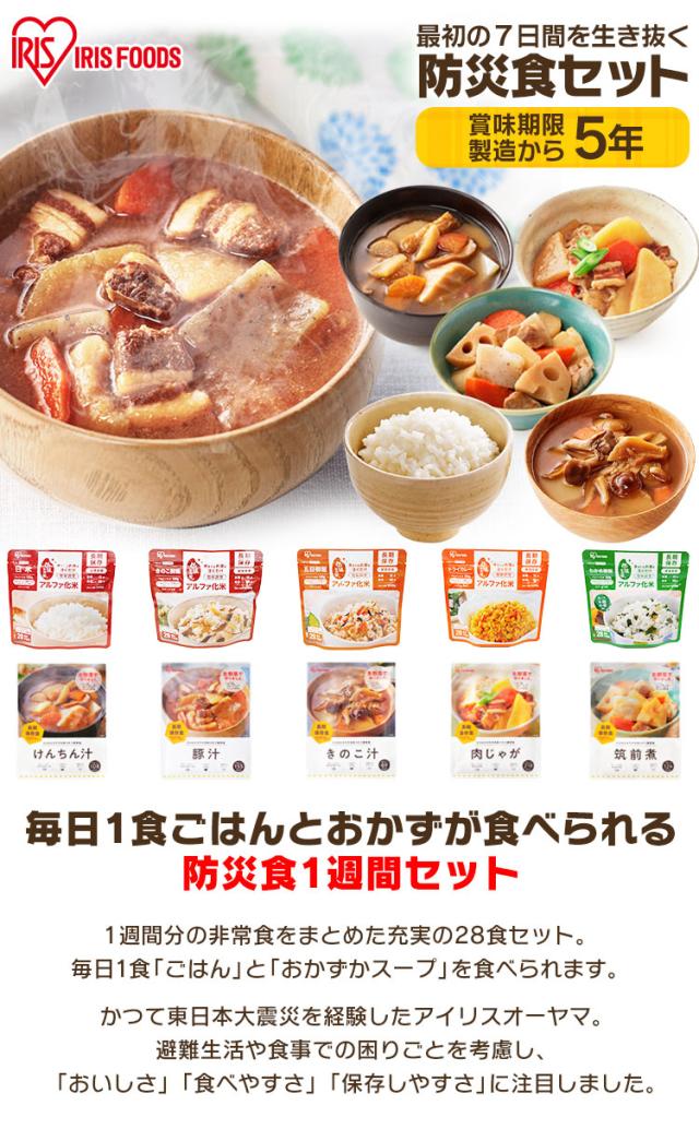 非常食セット 7日分 非常食 ごはん おかず スープ 10種28食セット 製造から5年保存 長期保存 防災食 アルファ米 白米 保存食 防災 備蓄 米 食料 レトルト食品 常温保存 長期保存食 備蓄食料 防災グッズ 食品 アイリスオーヤマ アイリスフーズ *