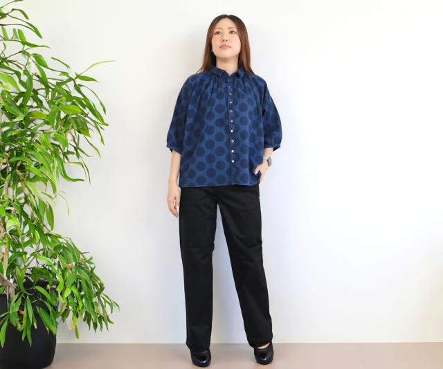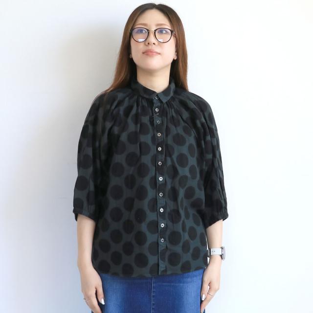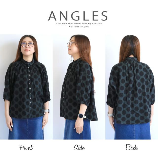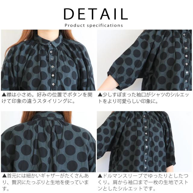 ドルマンスリーブ仕様で肩まわりをゆったりと包み込み、生地をたっぷり贅沢に使うことで生まれる落ち感のあるシルエットが、着るだけで女性らしい柔らかさを演出。首元には繊細なギャザーがあしらわれ、コンパクトな襟とのバランスで、シャツ全体のボリューム感を美しく引き立ててくれます。
