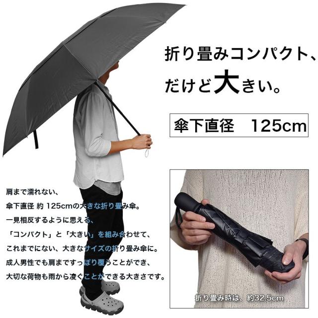 肩まで濡れない、傘下直径約125cmの大きな折り畳み傘。