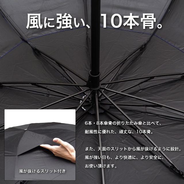 6本骨8本骨の折りたたみ傘と比べて、耐風性に優れた、頑丈な、10本骨。