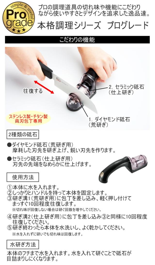 | 特徴 | ご家庭にプロの料理を。本格調理シリーズ、プログレード。 プロの調理道具の切れ味や機能にこだわりながら使いやすさとデザインを追求した逸品。 ダイヤモンドとセラミックの砥石で鋭い切れ味がよみがえる! 前後に押し引きするだけで簡単に包丁が研げます。 手にぴったりフィットするハンドルは握りやすい設計です。 すべり止め付きで安定して研げます。 |