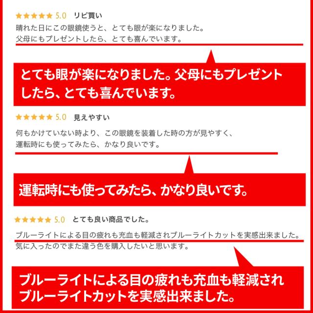 | 【高品質素材を採用】 | ・軽量/柔軟/高耐久のTR90を使用 ・傷がつきにくく自然な色合いのレンズ ・レビューを書いて365日延長保証 |