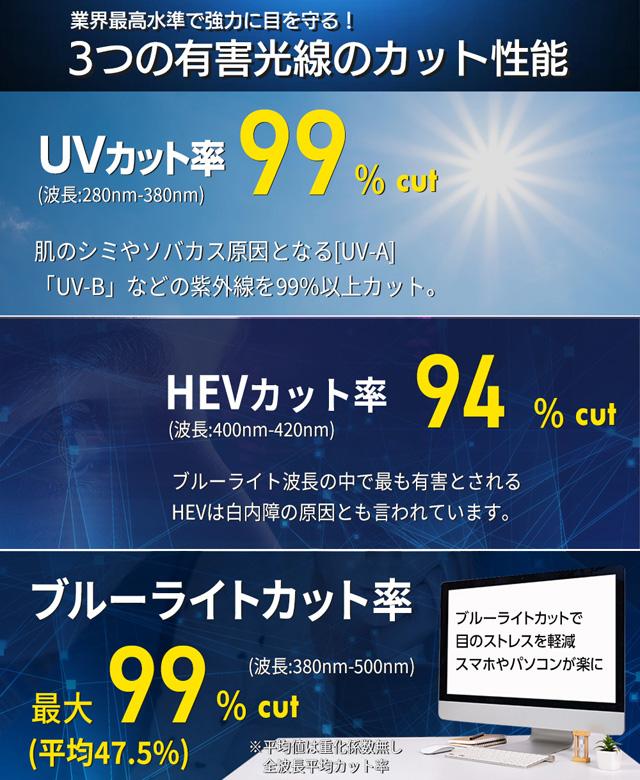 ブルーライト99.9%、HEV94.6%、UV99%以上カットし、