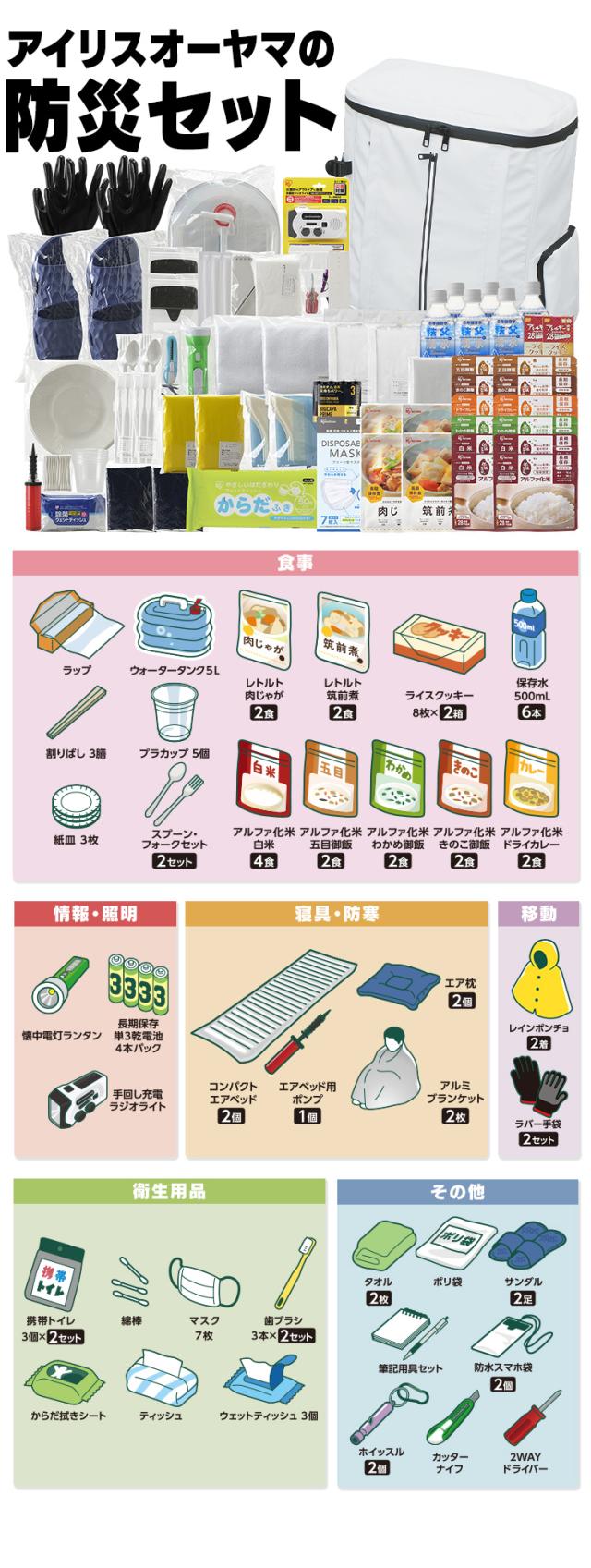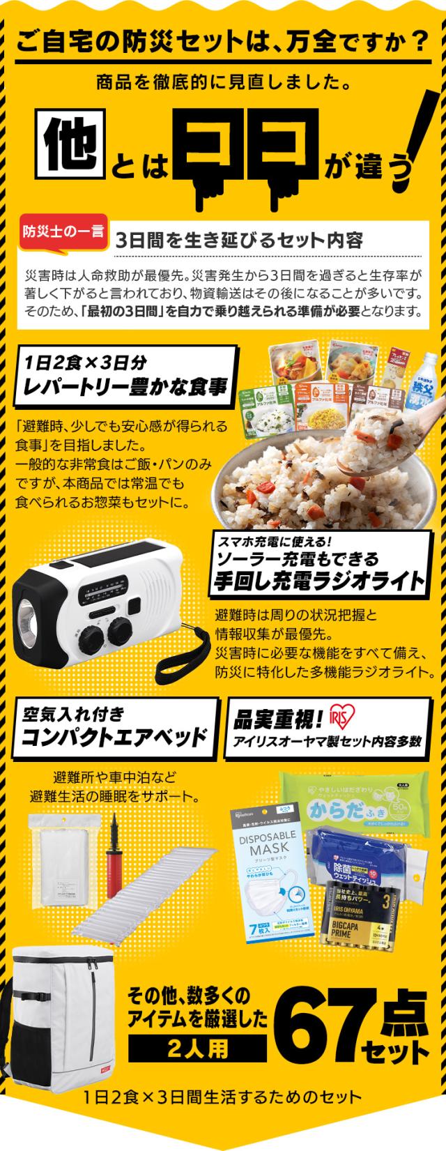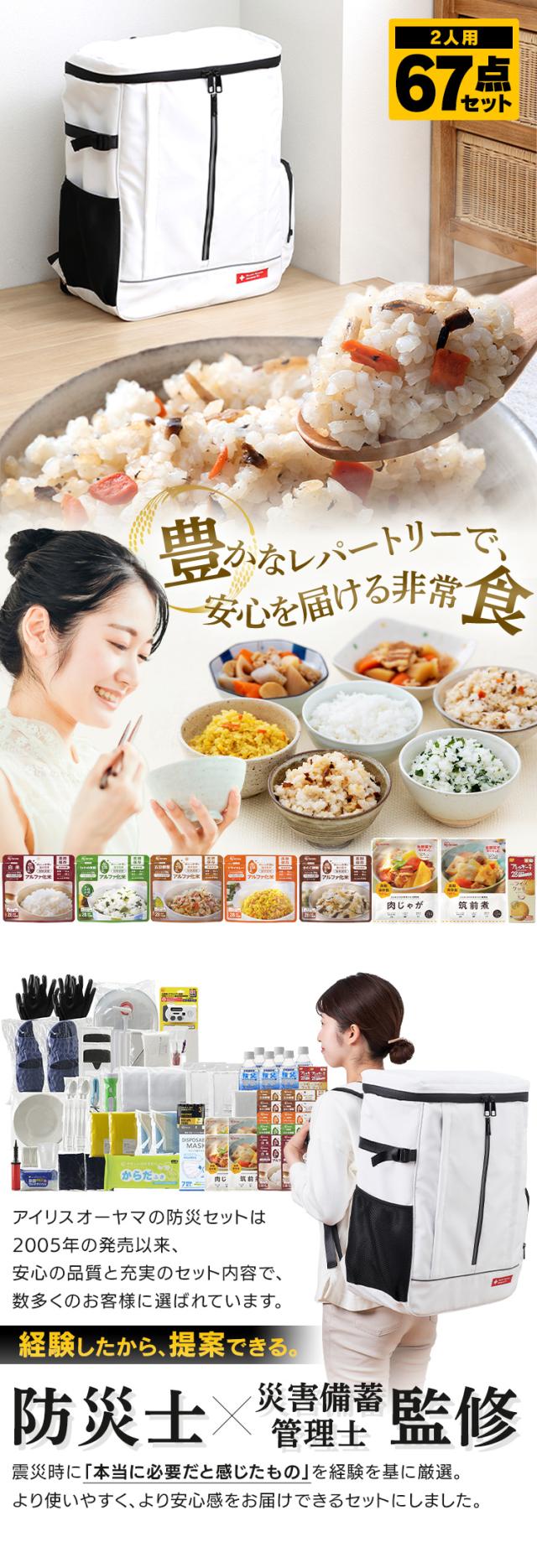 【防災士監修】 防災グッズ 67点 セット 防災セット 2人用 アイリスオーヤマ 非常食 6食分 防災食 保存食 保存水 防災リュック 防災 災害グッズ ライト 携帯トイレ エアーベッド シングル 給水 ウォータータンク 非常用持ち出し袋 避難グッズ NBS2-67 *