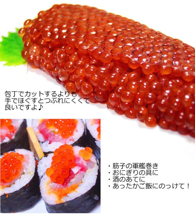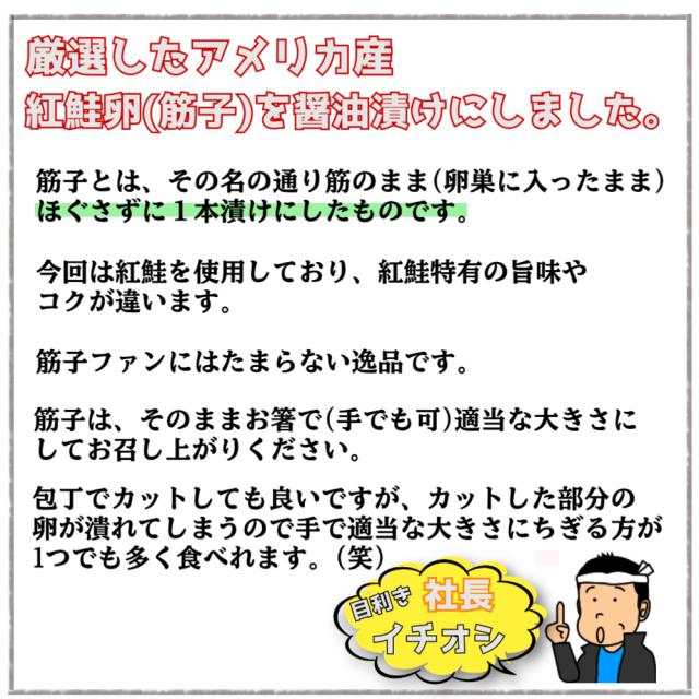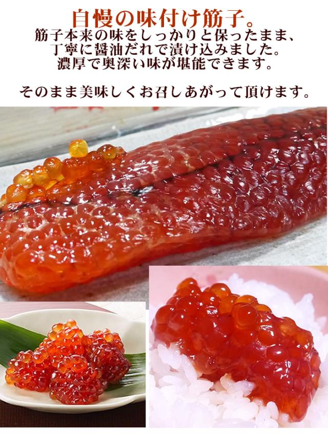 | 厳選したアメリカ産の紅鮭卵(筋子)を醤油漬けにしました。 筋子とは、その名の通り筋のまま(卵巣に入ったまま)、ほぐさずに1本漬けたものです。 今回は紅鮭を使用しており、紅鮭特有のうまみやコクが違います。 すじこ本来の味をしっかりと保ったまま、丁寧に醤油だれで漬け込みました。濃厚で奥深い味が堪能できます。 ご飯にもお酒にも合うのはもちろん、おにぎりの具にも最適ですので、お子様にも喜ばれています。 筋子ファンにはたまらない逸品です。 筋子は、そのままお箸等で(手でも)適当な大きさにしてご飯に乗せてOKです。 包丁でカットしてもよいのですが、カットした部分の卵がつぶれてしまうので、私なんかは手で適当な大きさにちぎってます。 |