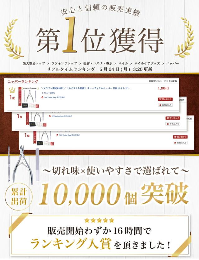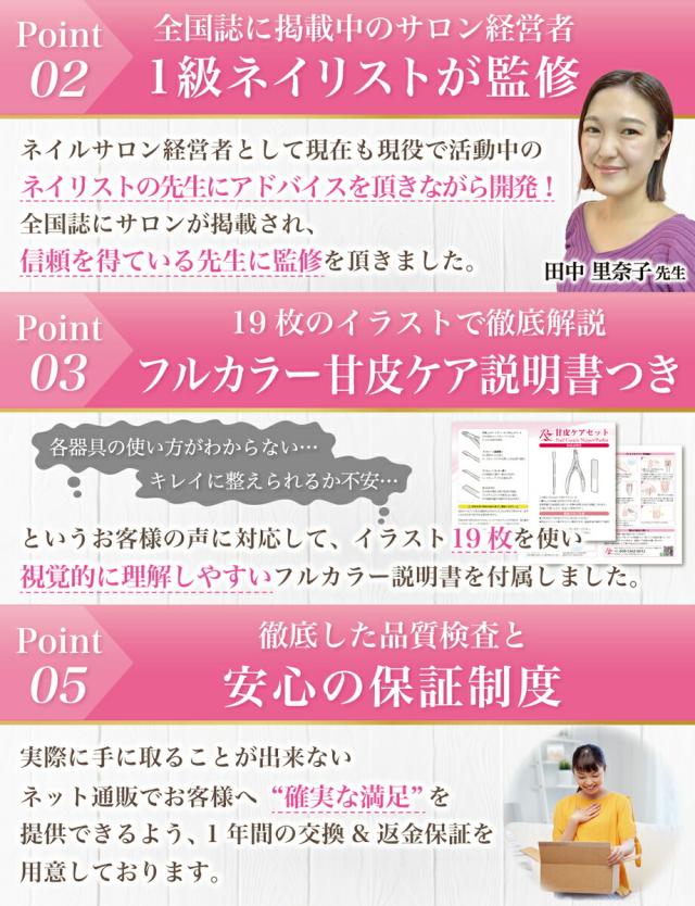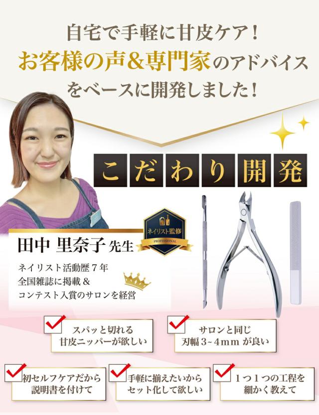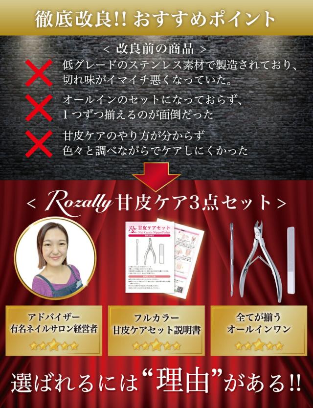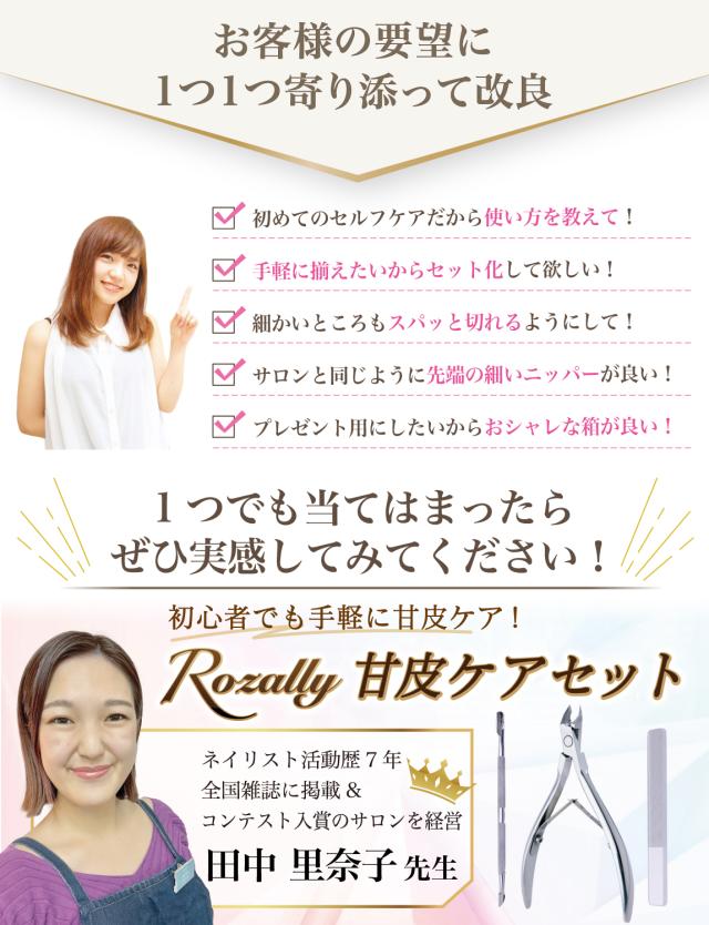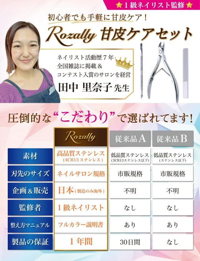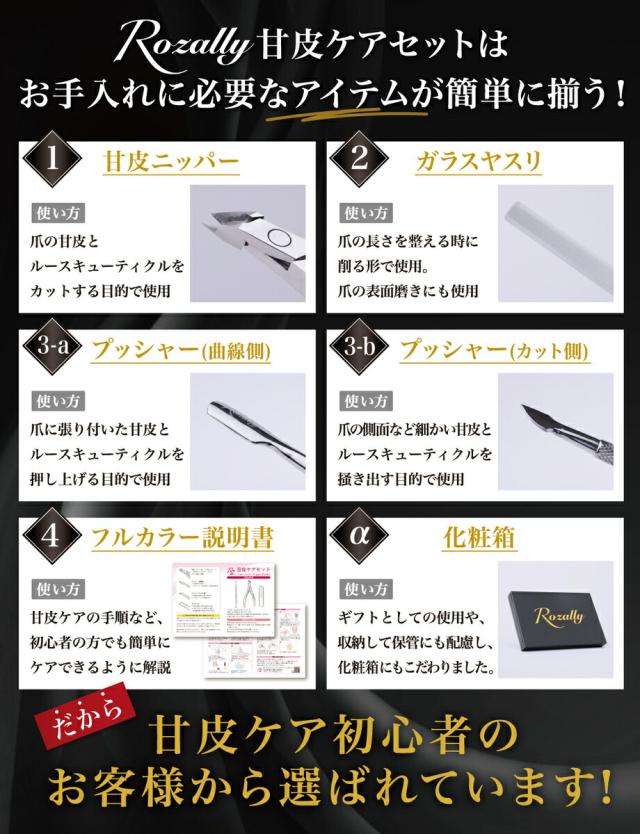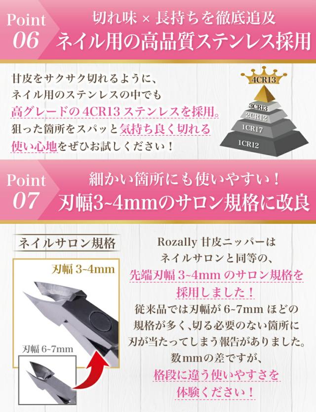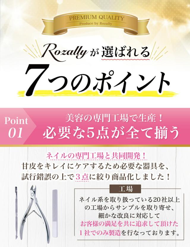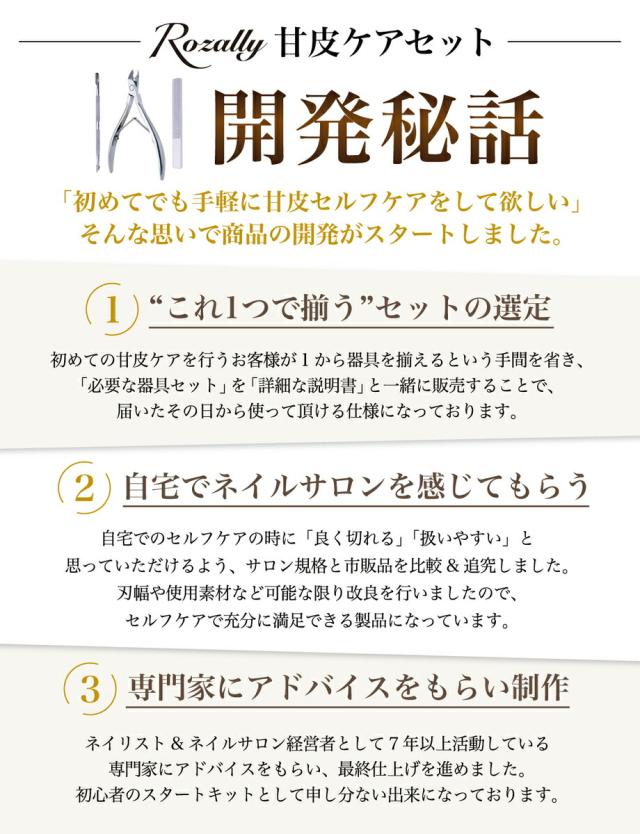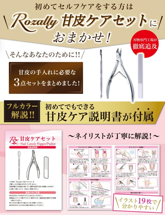 【こだわり】様々なメーカーから” 甘皮 ニッパー ”や” ネイルセット ”が販売されています。 Rozallyの ネイルケアセット は国内や国外で流通している様々なサンプルを取り寄せ、”噛み合わせ”と”切れ味”にこだわりを持って製造しました。初心者の方でも届いた日に あまかわ処理 ができるように、”キューティクルニッパー”と”プッシャー”と”爪やすり”をセットにして、フルカラーの説明書を付属したセット商品となっております。 爪 の事をしっかり考えたネイルセットを規格してスムーズな”あまがわ処理”ができるように規格しています。