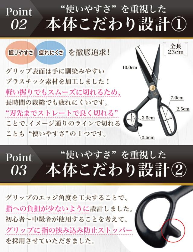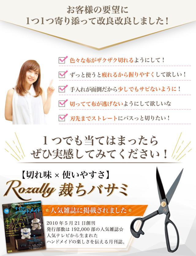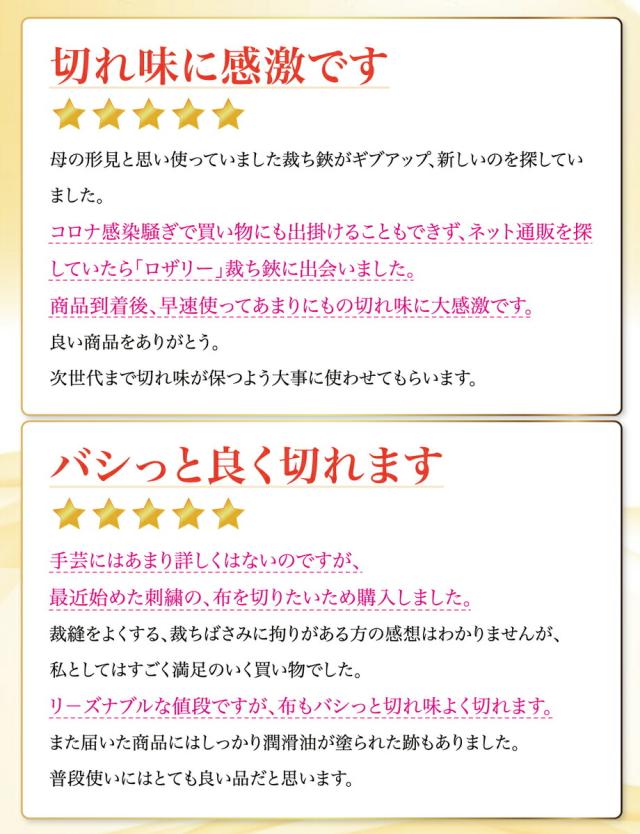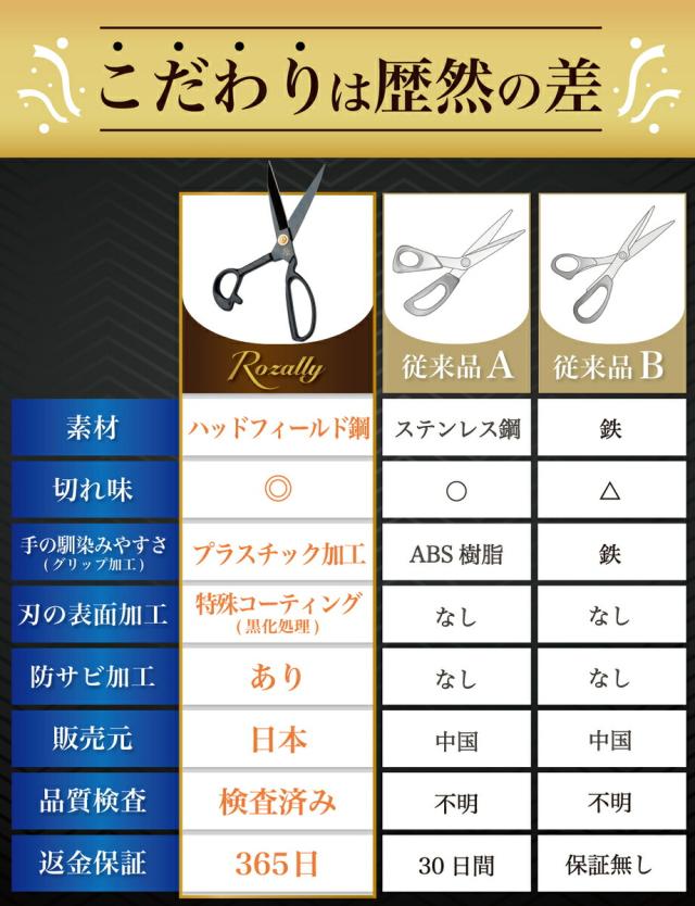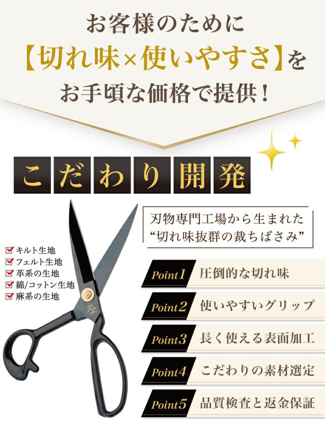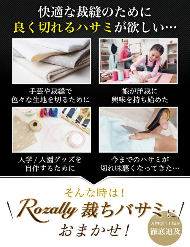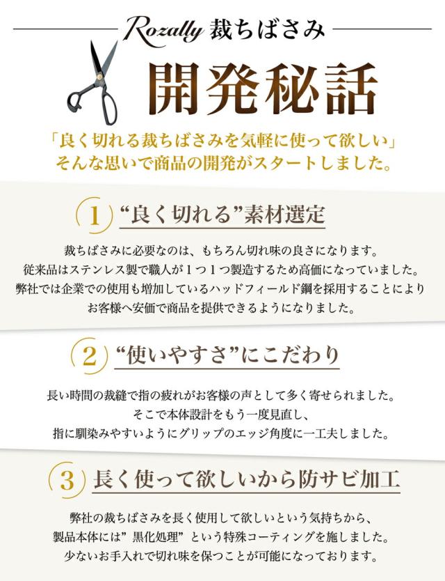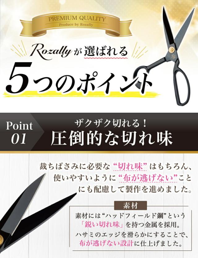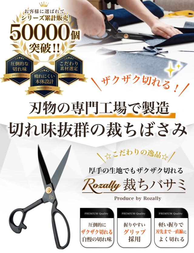 【サクサク切れる!】縫製や手芸などのハンドメイドで大活躍の”裁ちばさみ”です。コットン系の柔らかい生地 ~ 革系の堅めの生地までザクザク切ることができます。切れ味×使いやすさを徹底研究して、従来から使われているステンレスではなく、ハッドフィールド鋼を採用しました。【こだわり】様々なメーカーから裁ちばさみ , 布切りばさみが販売されていますが、Rozally 裁ちばさみは切れ味と使いやすさが一味違います。同じような見た目でも切れ味が異なるため10社以上の工場で1つ1つ比較を行い、1番優れた技術を持った工場でのみ製造を行っております。