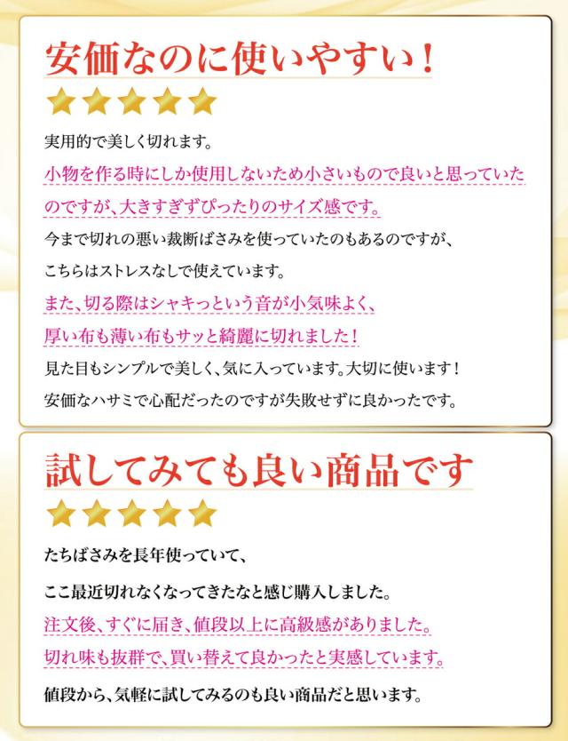 - 裁断ハサミを初めて買いましたが、こんなにも良く切れるのかと感動しました大変満足しております