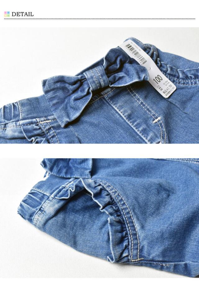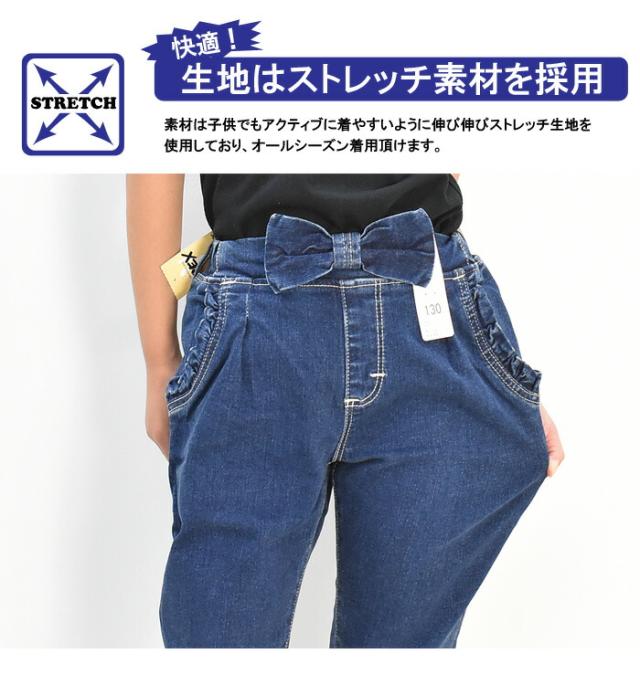 素材は子供でもアクティブに着やすいように伸び伸びストレッチ生地を使用しており、オールシーズン着用頂けます。フロントのリボンとポケットのフリンジがポイントの女の子向けジーンズ。ウエストゴムで着脱らくちん♪ 股上が深く、前にタックをとっているのでオムツ着用でももたつきません。穿かせるだけでおしゃれ感がグッと増すお助けアイテム。内側にはお名前を記入できるタグが付いています。