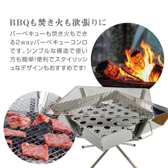 バーベキューも焚き火もできる2wayバーベキューコンロです。シンプルな構造で使い方も簡単!便利でスタイリッシュなデザインもおすすめです!