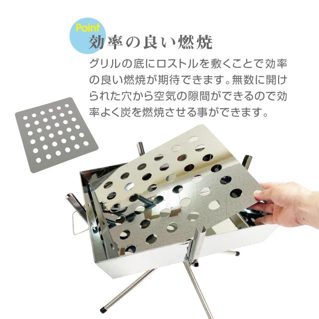 グリルの底にロストルを敷くことで効率の良い燃焼が期待できます。無数に開けられた穴から空気の隙間ができるので効率よく炭を燃焼させることができます。
