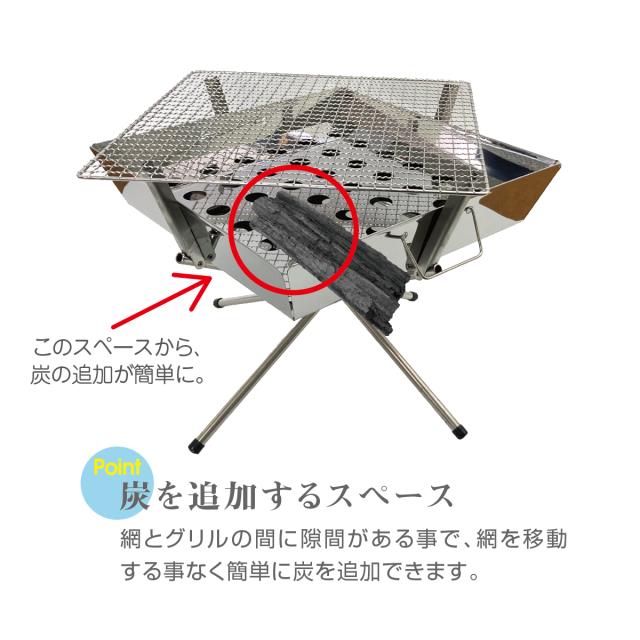 網とグリルの間に隙間があることで、網を移動することなく簡単に炭を追加できます。