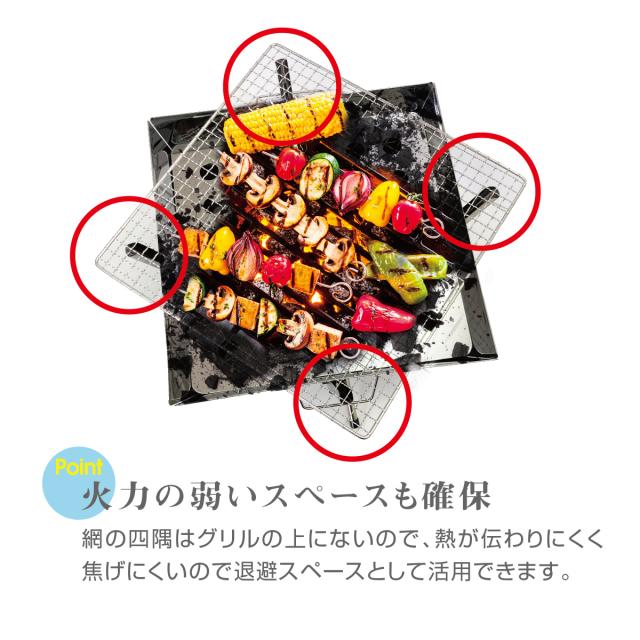 網の四隅はグリルの上にないので、熱が伝わりにくく、焦げにくいので退避スペースとして活用できます。