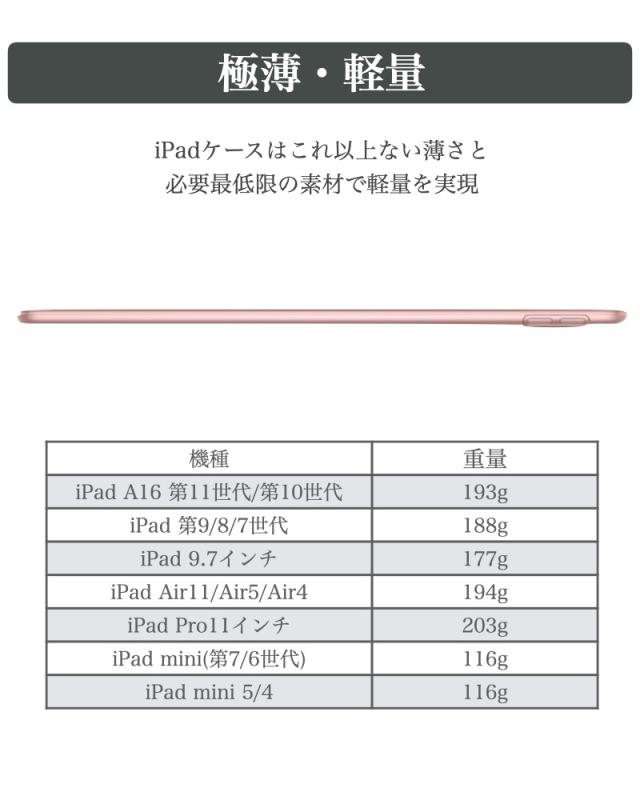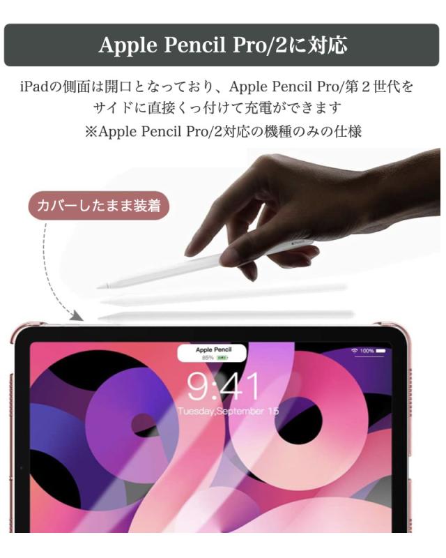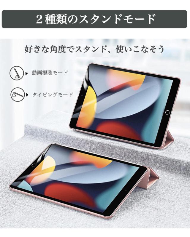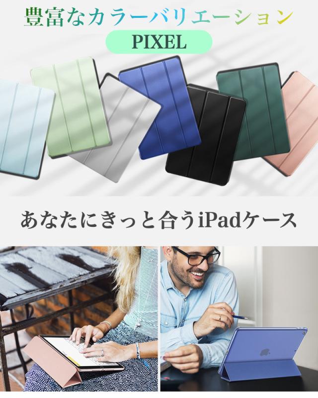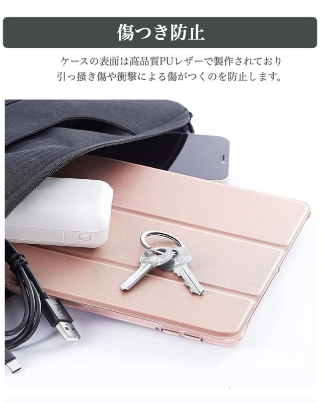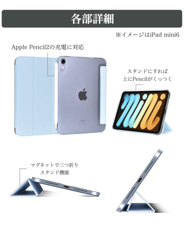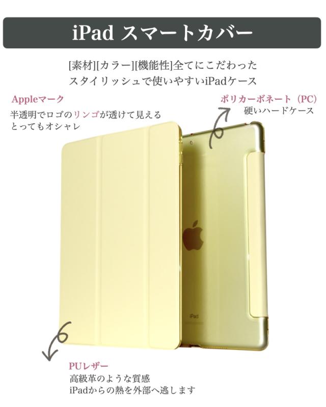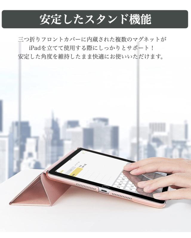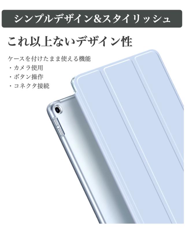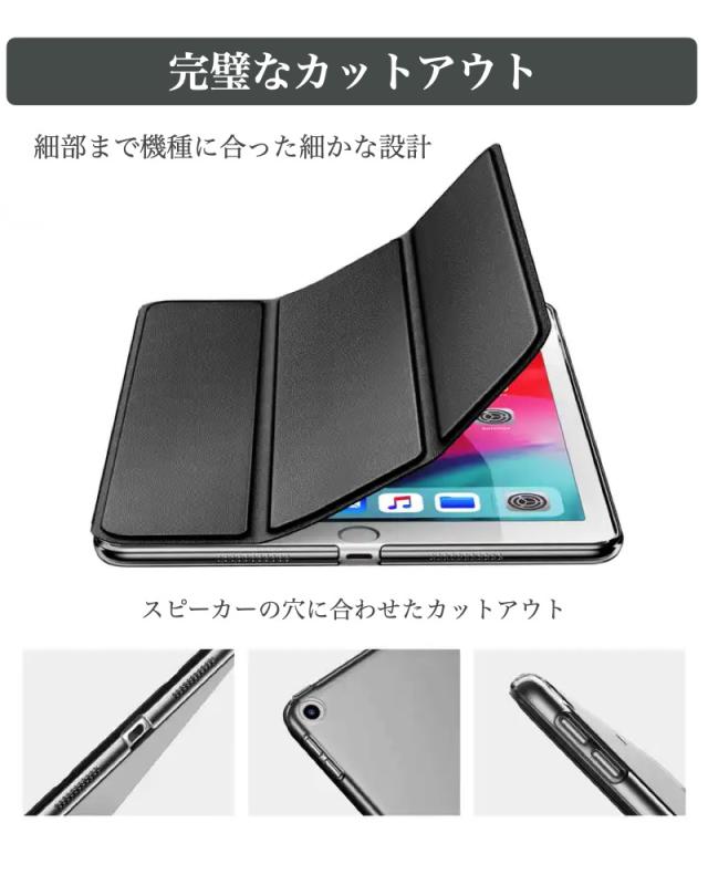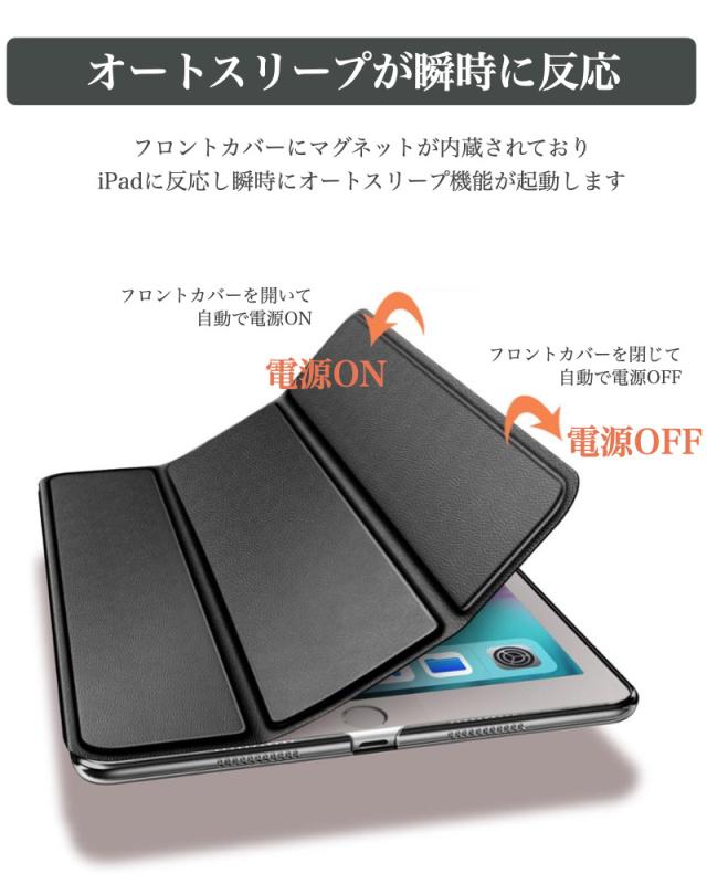 【三つ折りフロントカバー】風呂ふた仕様の三つ折りのフロントカバーは、高品質なPUレザー素材で仕上げられており、この価格では想像できないおしゃれで高級感のあるケースになっています。三つ折りフロントカバーには、複数のマグネットが均等に内蔵されています。【安定したスタンド機能】フロントカバーに内蔵された複数のマグネットにより、安定したスタンド機能をご利用いただけます。タイピングや動画視聴などiPadを立ててご使用の際に、とても便利にご利用いただけます。【半透明バックケース】 バックケースは、三つ折りフロントカバーと同じ色合いの半透明色で、Appleのロゴマークのリンゴがうっすらと透けて見えます。半透明のバックケースには強度のあるポリカーボネート素材を使用しており、傷や指紋が付きにくい特別な処理が施されています。【オートスリープ機能】オートスリープ機能で、バッテリーが無駄に消費してしまうのを防ぎます。
