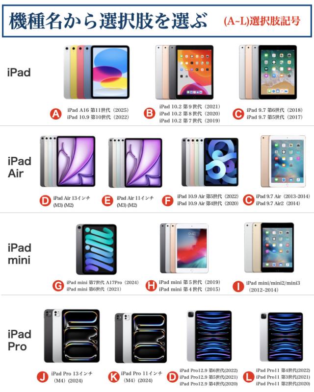 | サイズ | ・iPad Air 11インチ(M2)(2024) ・iPad Air 13インチ(M2)(2024)※iPad Pro12.9インチと兼用ケースとなります。カメラカットアウトはスクエアタイプとなります。 ・iPad Pro 11インチ(M4)(2024) ・iPad Pro 13インチ(M4)(2024) ・iPad 10.9インチ 第10世代 ・iPad 10.9インチ 第10世代 ・iPad 10.2インチ 第9世代/第8世代/第7世代 ・iPad 9.7インチ 第6世代/第5世代 ・iPad Air 11インチ (M2)(2024) ・iPad 10.9インチ Air5 ・iPad 10.9インチ Air4 ・iPad 10.5インチ Air3 ・iPad Air2 ・iPad Air ・iPad mini ・iPad mini2 ・iPad mini3 ・iPad mini4 ・iPad mini5 ・iPad mini 7(A17 Pro) ・iPad mini6 ・iPad Pro11インチ(2022/2021/2020) ※サイズが多種ございます。 『iPad識別画像』をご確認くださいませ。 |