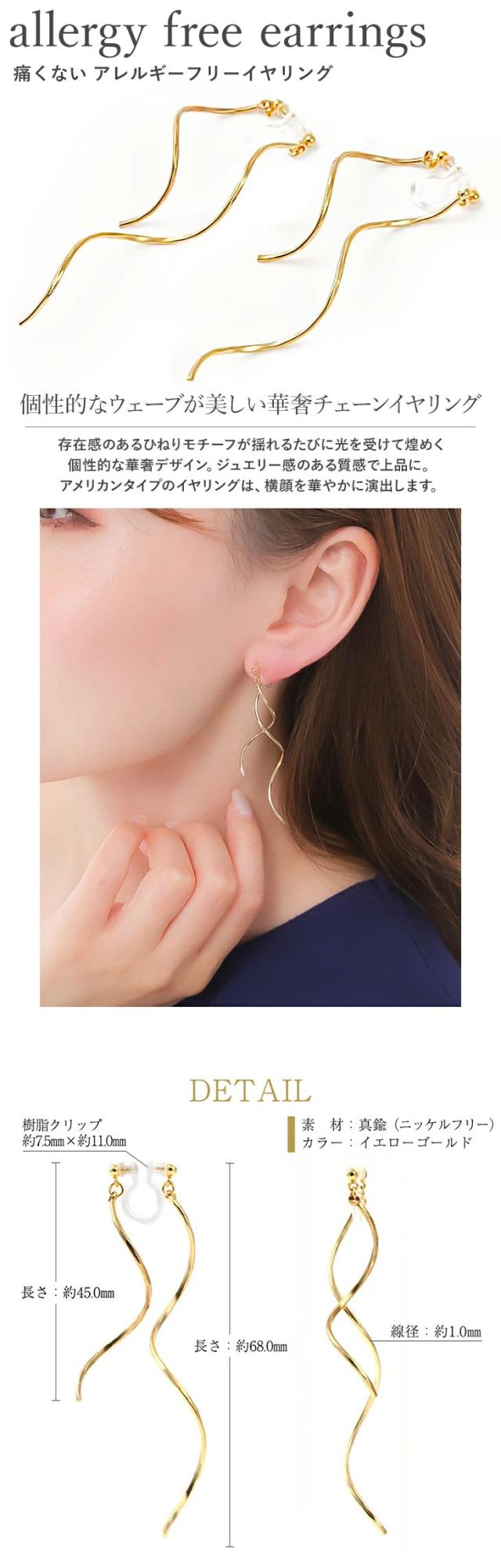 イヤリング レディース ノンホール おしゃれ 金属アレルギー 18金 アレルギー ニッケルフリー アレルギー対応 樹脂 クリップ ゴールド アメリカン チェーン 揺れる 両耳 アクセサリー 可愛い ジュエリー 痛くない 誕生日 クリスマス プレゼント アクセサリー