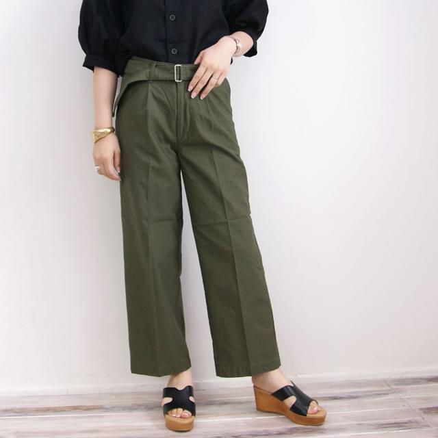 ■DMG ドミンゴ 商品詳細 D.M.G(ドミンゴ)より逆綾バックサテンベルテッドパンツが登場しました。 オランダ軍で採用されていた生地を参考にオリジナルで製作した逆綾のバックサテン生地を使用。 通常の綾目とは逆の組織にすることで丈夫で光沢に優れている点が特徴です。 そのため高級感のあるバックサテン素材に仕上がっています。 ストンと落ちるようなストレートでワイドなシルエットは気になる脚のラインをカバーしてくれる優れモノ。 タック入りでヒップまわりも余裕のある履き心地になっています。 センタープレスが美しい形を保ち、上品な雰囲気にも◎ アンクル丈で抜け感があり、足首見せをすることでより女性らしいスタイリングにもなります。 今年らしいシルエットの一本です。 ラフなトップスでまとめたり、タイトなトップスでバランスを楽しむのもオススメです◎ ナチュラルな風合いがデイリーユースにもぴったりです。 付属のベルトは取り外し可能なので着こなしの幅を広げてくれますよ。 |