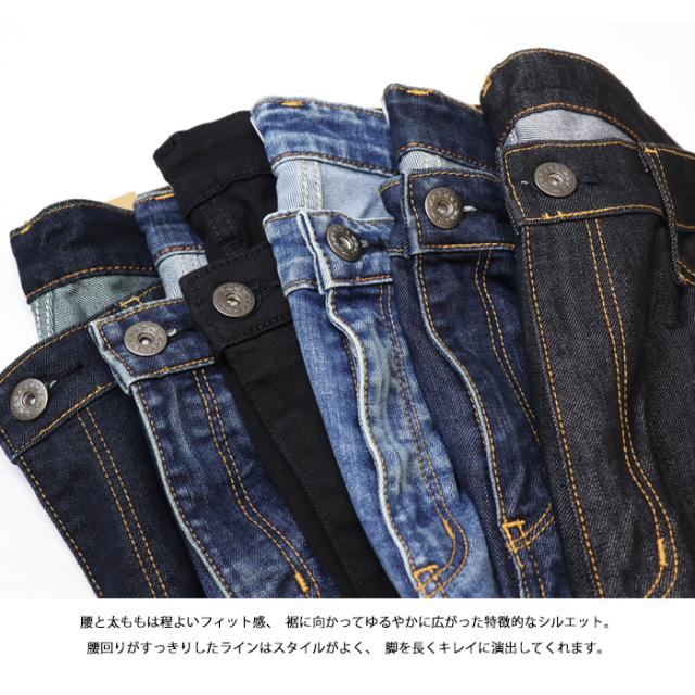 腰と太ももは程よいフィット感、裾に向かってゆるやかに広がった特徴的なシルエット。腰回りがすっきりしたラインはスタイルがよく、脚を長くキレイに演出してくれます。