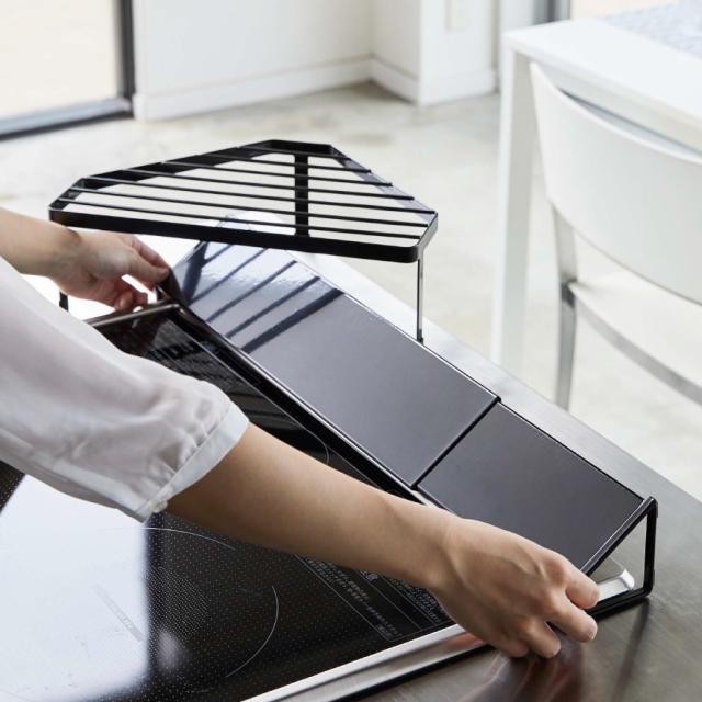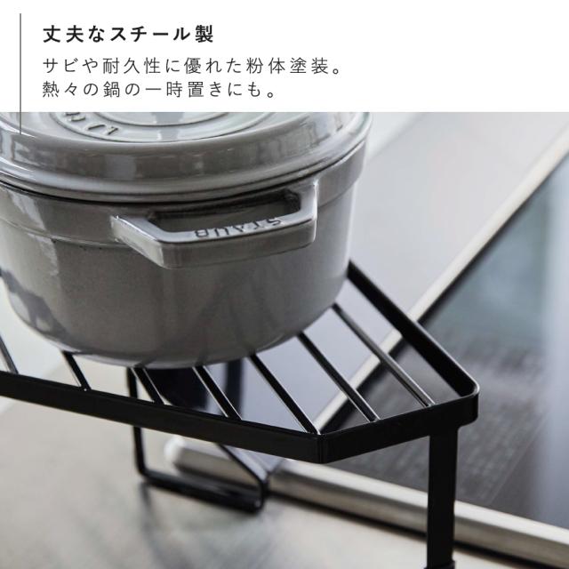 コンロの奥のスペースを有効活用!高さがあるから排気口カバーの上から設置できるコンロラック!