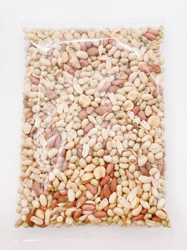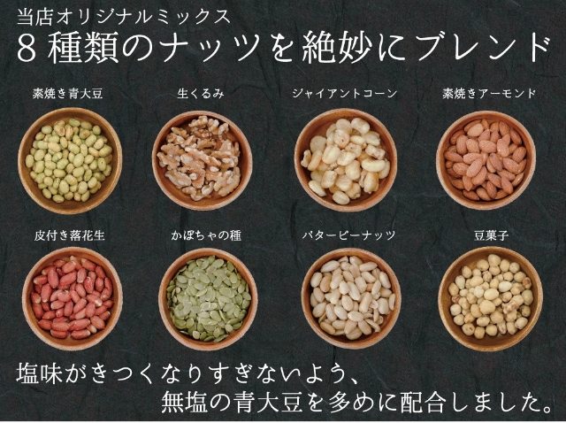 ■原材料名:落花生(中国)、青大豆(中国・遺伝子組み換えでない)、うす掛けピーナッツ(中国)、アーモンド(アメリカ)、とうもろこし(ペルー・遺伝子組み換えでない)、くるみ(アメリカ)、かぼちゃの種(中国)、寒梅粉(もち米)、小麦粉、グラニュー糖、加工でん粉、植物油脂、食塩、胡椒/調味料(アミノ酸等)、乳化剤、(一部に小麦・落花生・大豆・くるみ・アーモンドを含む)